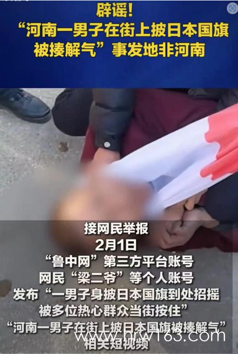 最近,一个叫“鲁中网”的第三方平台账号,还有网民“梁二爷”等个人账号,发布“一男子身披日本国旗到处招摇,被多位热心群众当街按住。”“河南一男子在街上披日本国旗被揍解气”关短视频。